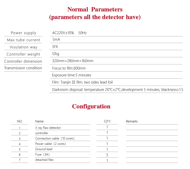 Darkroom disposal temperature 20℃±2℃,development 5 minutes, blackness≥1.5 Film Tianjin Ⅲ film, two sides lead foil Exposure time 5 minutes Focus to film 600mm Insulation way SF6 Max tube current 5 mA Power supply AC220V±10% 50HZ Controller dimension(mm×mm×mm) 320×280×160 Generator dimension(mm×mm×mm) 320×320×680 Controller weight(kg) 12 Generator weight(kg) 37 Maximum penetration(Q235) 59 Radiation angle (40+5)° Focus dimension(mm×mm) 2.5×2.5 Capacity(kW) >3.5 Output voltage(KV) 200—350 -